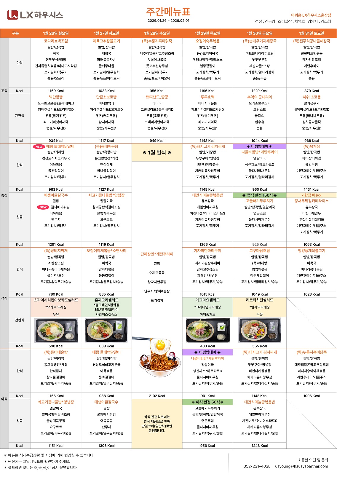 2026.01.26~ 2026.02.01 페이지 정보 작성자 엘지하우시스식단표 댓글 0 조회 139 작성일 26.01.23 본문 . 첨부파일 260126.jpg (518.7K) 목록 Prev2026.02.02~ 2026.02.0826.01.30 Next2026.01.19 ~ 2026.01.25 26.01.16