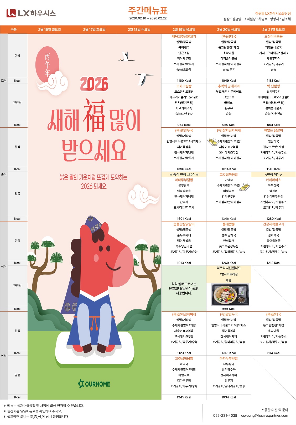 2026.02.16~ 2026.02.22 페이지 정보 작성자 엘지하우시스식단표 댓글 0 조회 101 작성일 26.02.13 본문 . 첨부파일 260216.jpg (413.9K) 목록 Prev2026.02.23~ 2026.02.2926.02.20 Next2026.02.09~ 2026.02.15 26.02.06